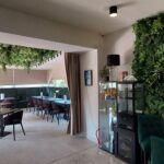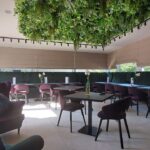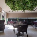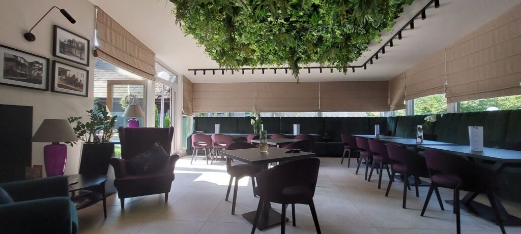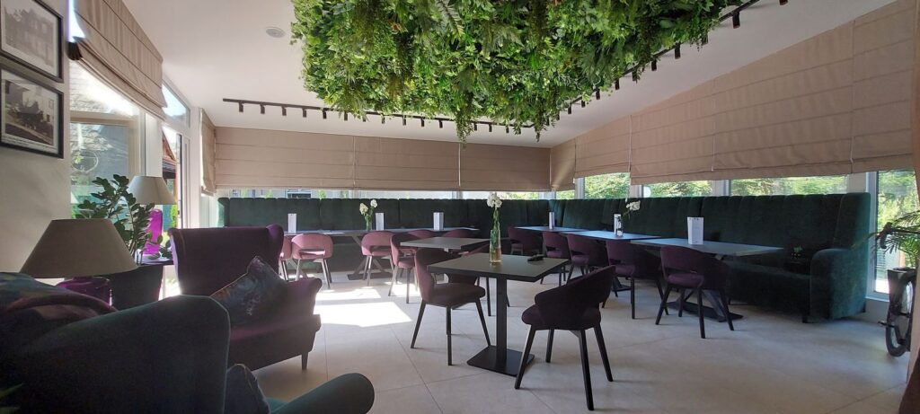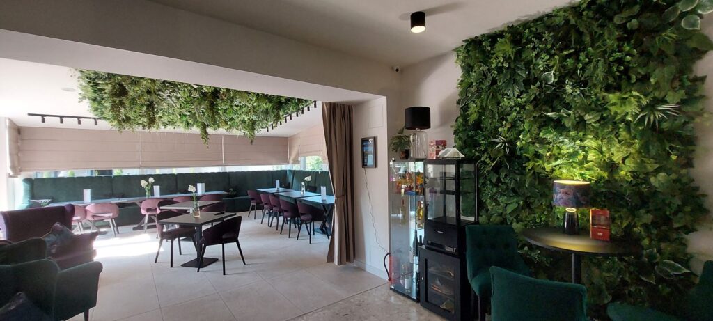 Hotel Wiosna…, w którym przez cały rok jest wiosna a to dzięki ciekawej zielonej kompozycji na suficie oraz ścianie, która jest elementem wystroju obok recepcji.
