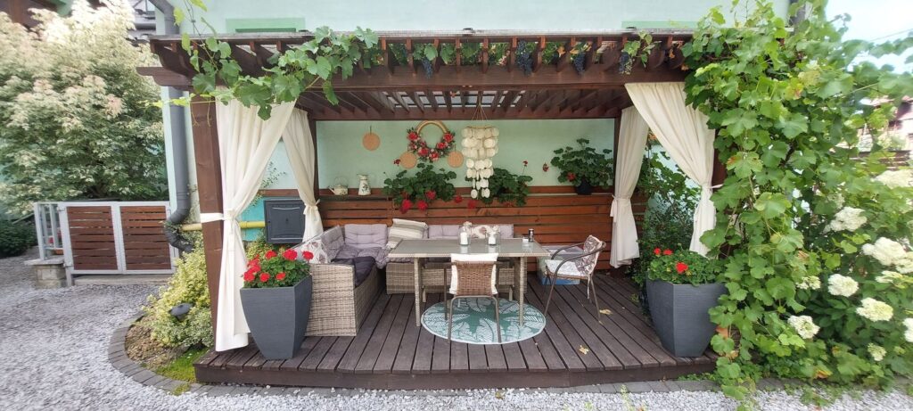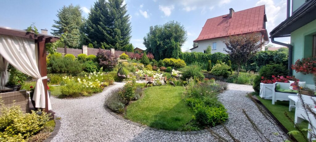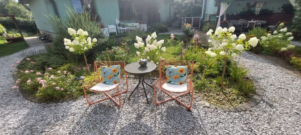 Poza tym mamy tutaj do dyspozycji zadbany i ładnie urządzony ogród z krzesłami, stolikami i innymi miejscami do relaksu; miejsce idealne, żeby zrelaksować się z książką, podcastem lub po prostu zatopić się w jednym z podwieszanych siedzisk.