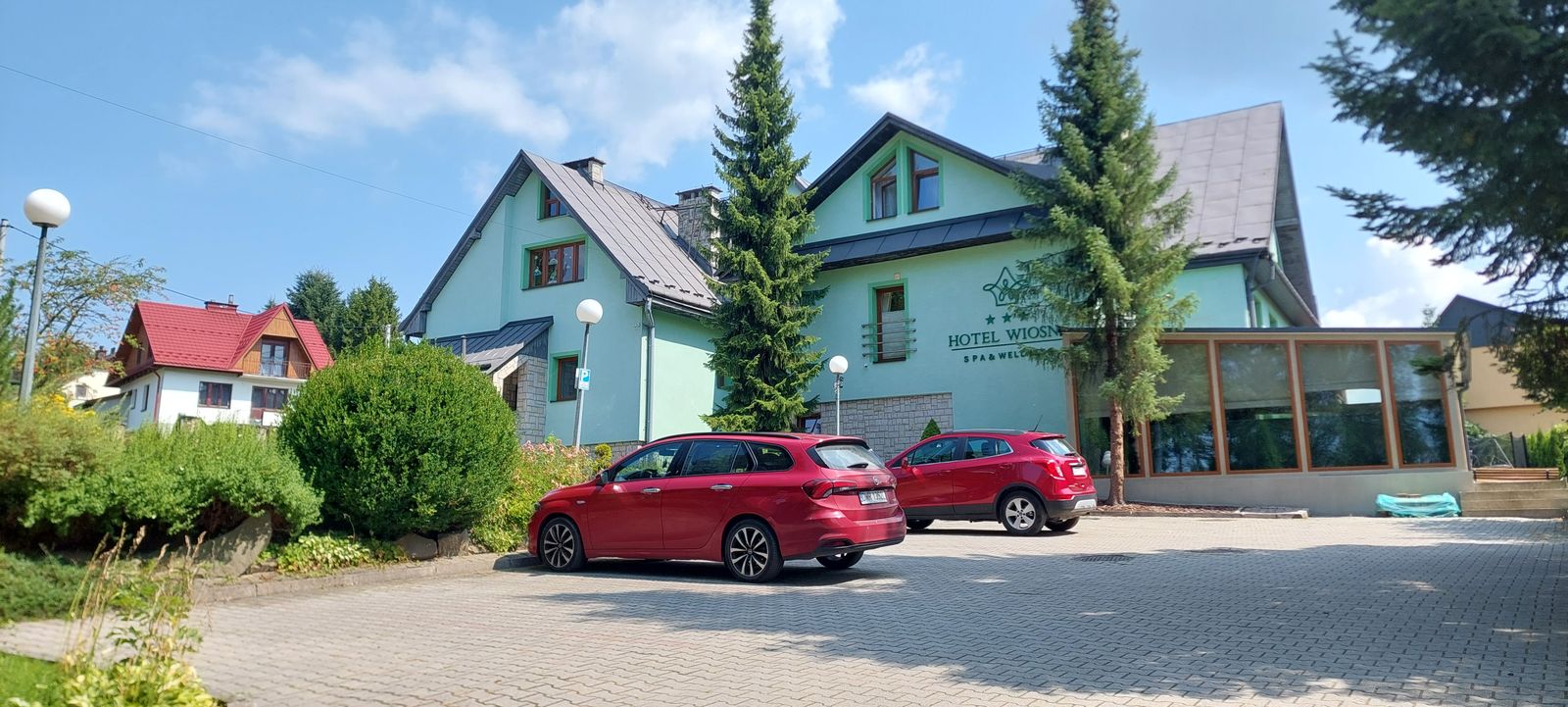 Hotel Wiosna jest położony lekko na uboczu względem drogi głównej a jednocześnie zaledwie ok.10-15 minut spacerem od Parku Zdrojowego, z którego możemy udać się też na Bulwary.
