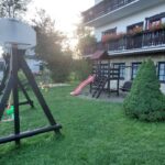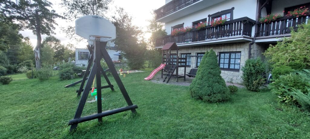 Na zewnątrz mamy duży, ogrodzony ogród wraz z placem zabaw dla dzieci (huśtawki, piaskownica, zjeżdżalnia itp.) a także