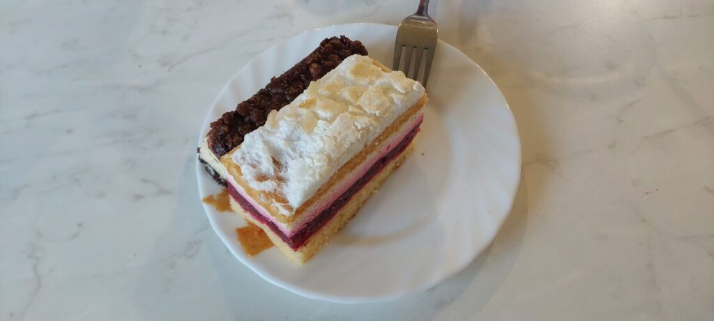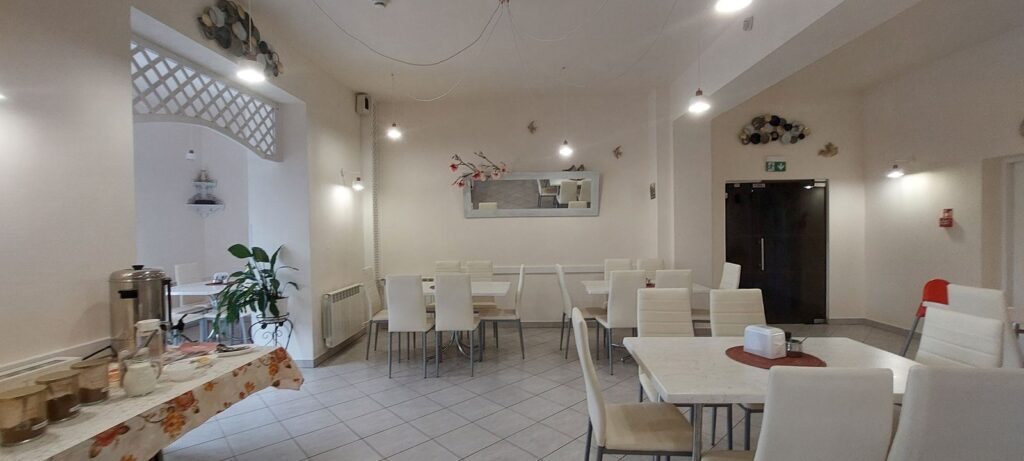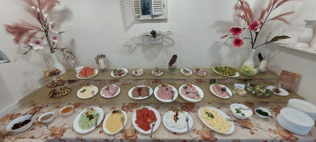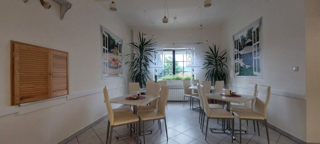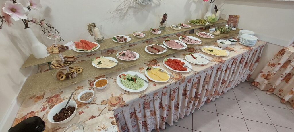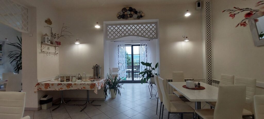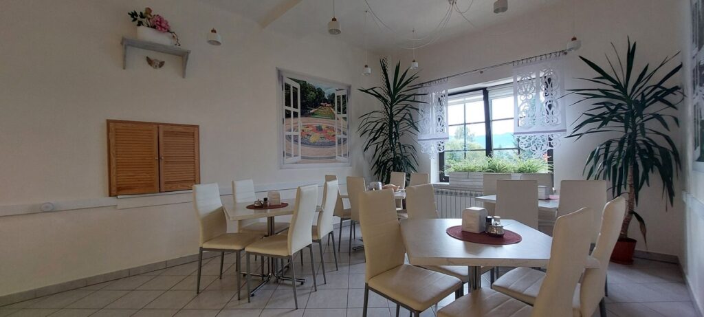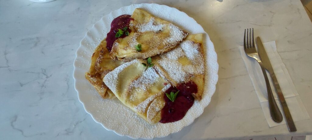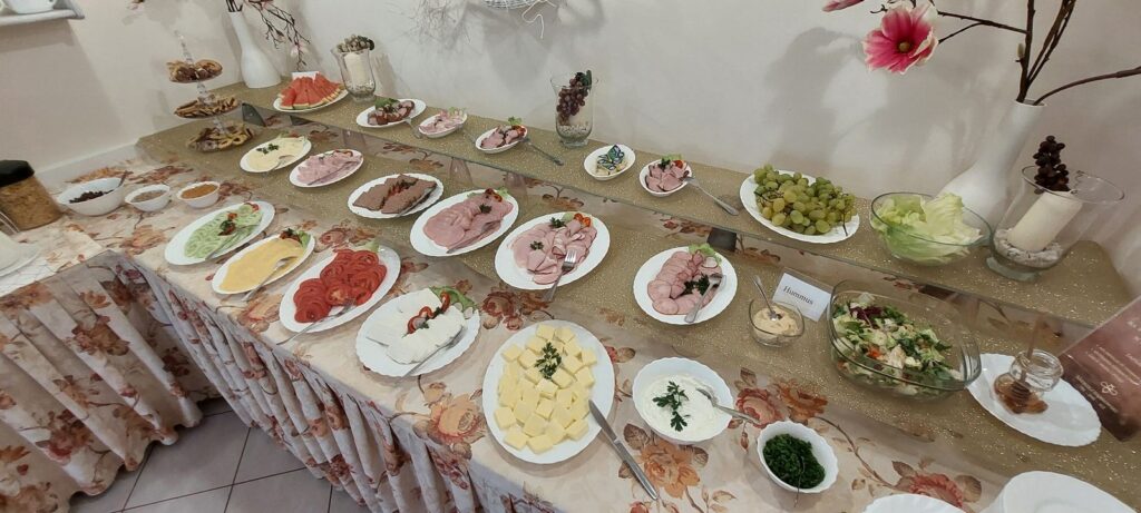 Naleśniki z serem i musem malinowym, leczo, domowe ciasta…wszystko ładnie podane i nie pozostawiające cienia wątpliwości, że pracują tutaj ludzie z dużym doświadczeniem w gastronomii. Śniadania także były urozmaicone, z owocami i ciastem na deser. Jest oferowane zarówno śniadanie jak i obiad a także kolacja.